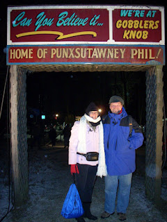 Ground Hog's Day is definitely something that's right with the world. Not the movie by that name (although it is a classic), but the actual event held in Punxsutawney, Pennsylvania. I had always wanted to go to Punxsutawney (derived from Indian word for "town of the sand flies") on that day ... and several years ago the day fell on a Saturday, so Barb and I went off to check it out. Every hotel in the area was booked, so we had to stay at a rest stop motel along Route 80 outside of DuBois. We arrived there late Friday, and went right to bed, because we had read that you need to get to Punxsutawney quite early to get tickets to ride one of the buses that takes you out to Gobbler's Knob, where the festivities are held.